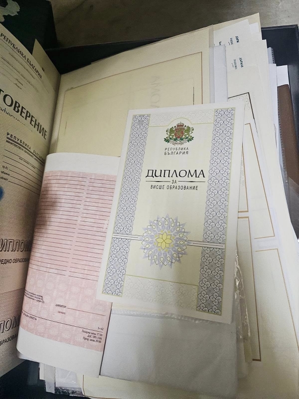 При извършените действия по разследването са открити множество празни бланки, заготовки, печати на различни университети, училища, нотариуси и частни фирми, както и материали и специализирана техника за дигитален печат.
