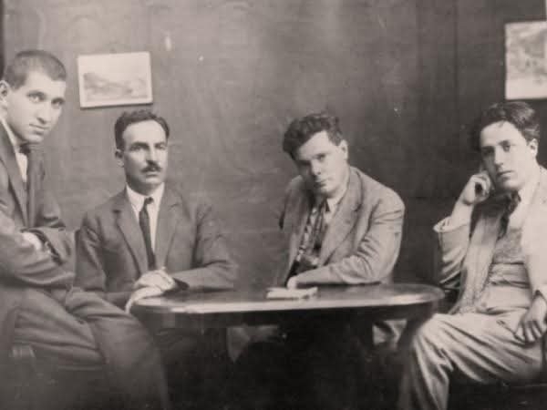 Бащата на Цветан Тодоров - проф. Тодор Боров (първият в ляво) в компанията на колегите от кръга "Развигор" Елин Пелин, Александър Балабанов и Д.Б.Митов.