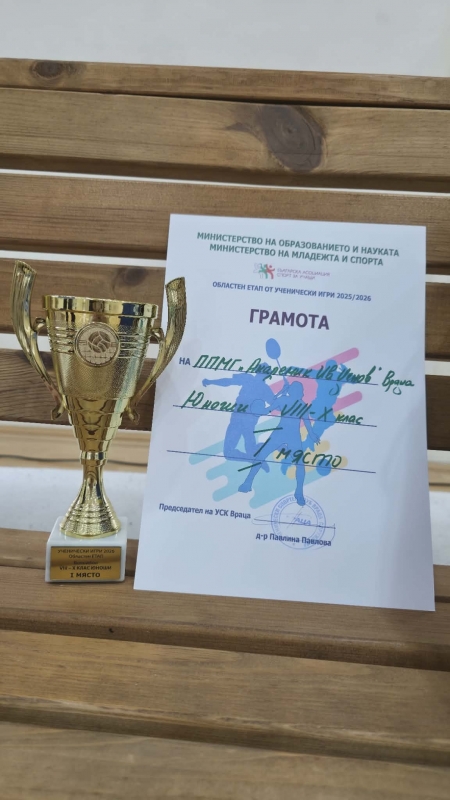 Отборът на ППМГ - Враца завоюва първо място на Областния етап на "Ученическите игри за учебната година 2025/2026 година" по волейбол за юноши в категория VIII - X клас.