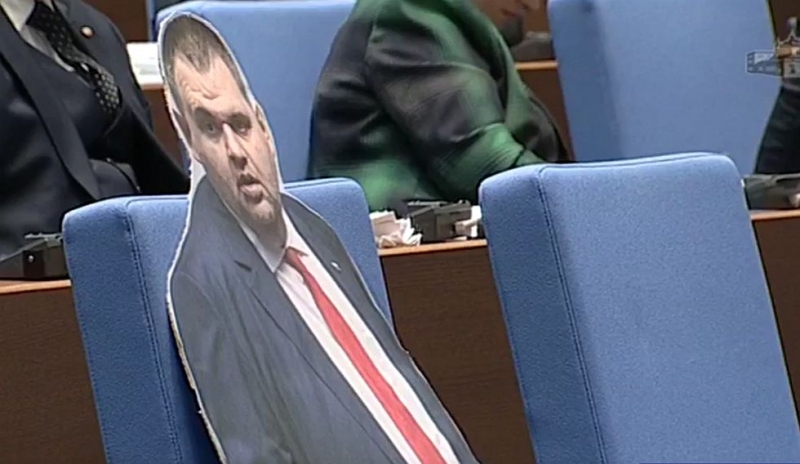Часове преди протеста срещу кабинета "Желязков" депутатът от ПП-ДБ Елисавета Белобрадова внесе в пленарната зала хартиена фигура на лидера на "ДПС-Ново начало" Делян Пеевски и я постави на стол в редицата на парламентарната група.