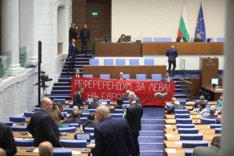 „Нестандартна провокация накара всички отново да заговорят за референдума за лева. Днес парламентарната група на „Възраждане“ внесе като задължителна точка в дневния ред референдума на президента за запазване на българския лев. Президентството не успя да организира кой да прочете мотивите на предложението, а парламентът отхвърли предложението на президента за провеждане на национален референдум. В дългите почивки на изчакване на техен представител, по идея на „Движение 23“, с които „Възраждане“ подписа партньорство преди няколко месеца, беше проведена артистична провокация.