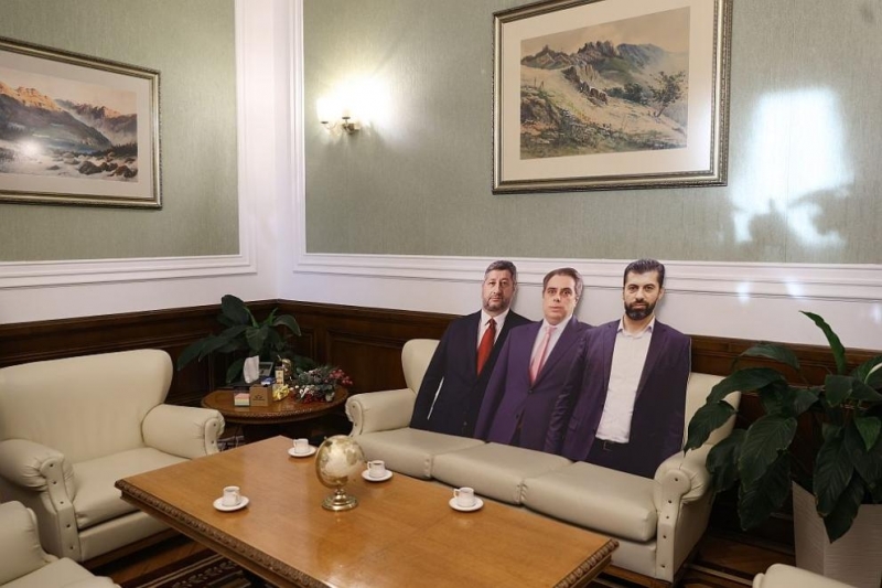 В кабинета на Пеевски бяха изложени фотографии от времето на „сглобката“. На бюрото му бяха поставени законопроектите, под които стоят съвместните им подписи, променената Конституция на България, „която заедно приехме – може би и от нея се отричат“. „Защитавахме Украйна отново заедно“, посочи Пеевски, показвайки снимка с президента Володимир Зеленски, „и от това сигурно се отричат“. Лидерът на ДПС-НН показа и разпечатани есемеси, които имали помежду си.