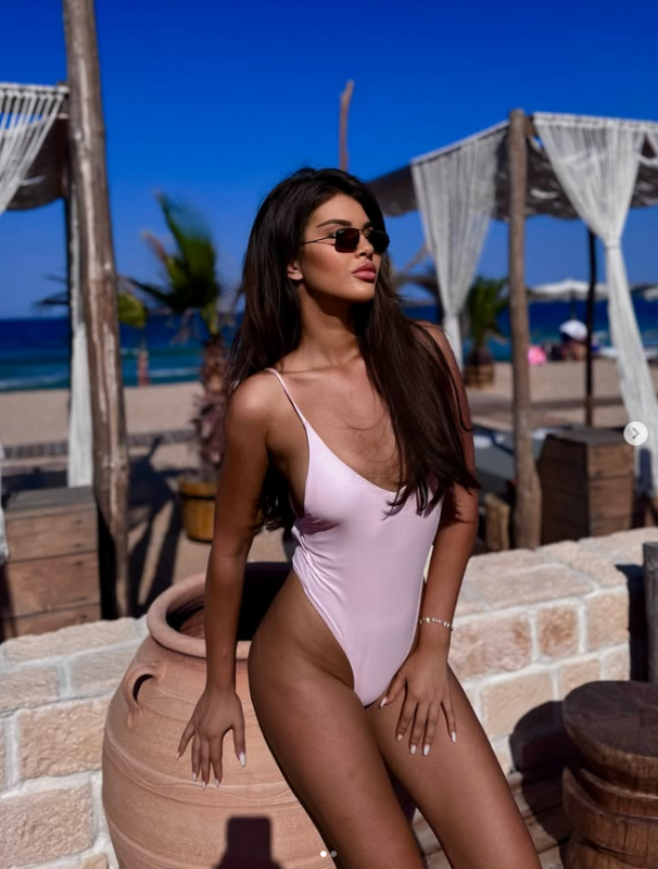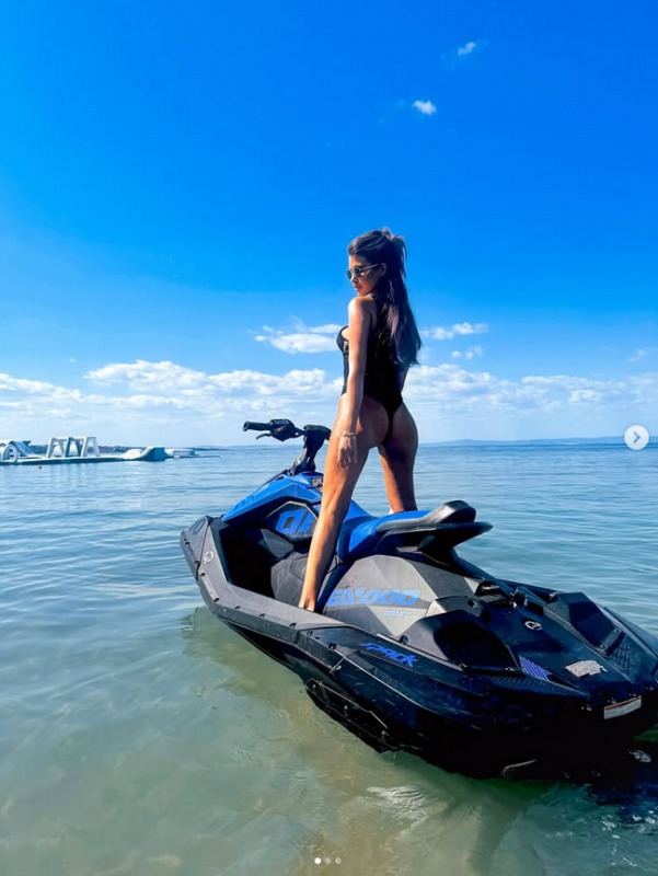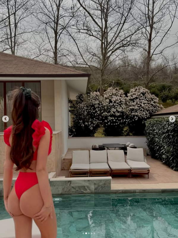 Красавицата позира край басейн, облечена в ярък червен бански, който подчертава фигурата ѝ и не оставя много на въображението. Снимките излъчват самочувствие и стил, а летният вайб е повече от осезаем.