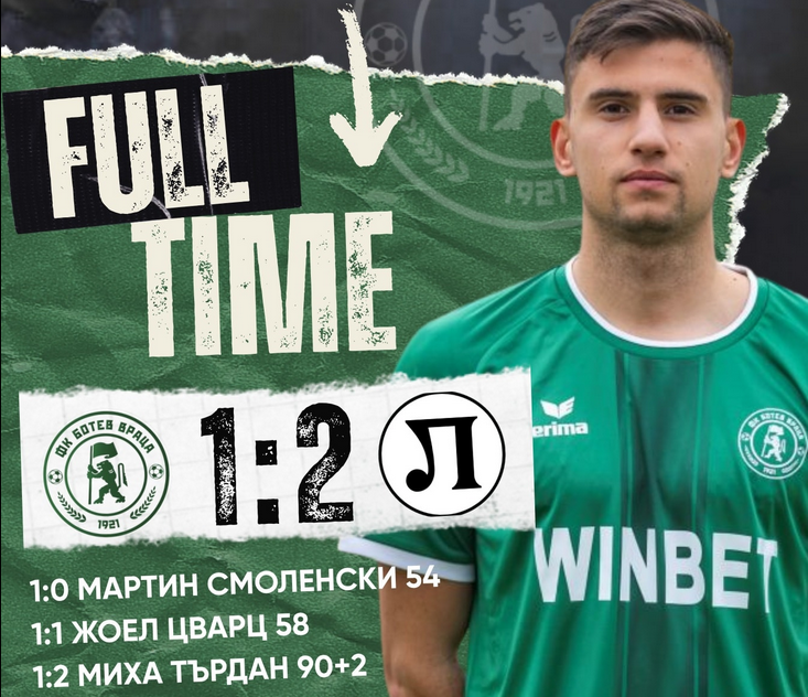В първата минута на добавеното време "смърфовете" стигнаха до обрат. Жулиен Лами беше изведен по десния фланг, откъдето центрира към Миха Търдан, а той от движение засече топката във вратата на "Ботев" (Враца).