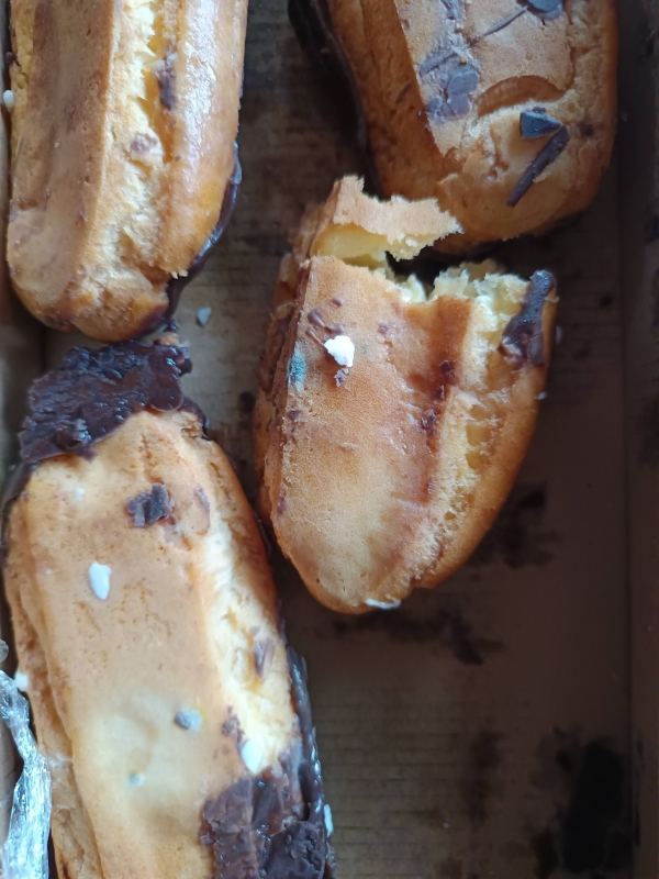 Случката е от неделя, а за нея съобщи вбесен клиент на веригата в една от групите във фейсбук. Човекът си купил еклери от магазина в кв. “Изгрев“. Когато обаче ги отворил, за да ги консумира, останал втрещен – те били плесенясали. Според етикета обаче те били в срок. Той пък бил същият като датата на производство – много странно, нали?