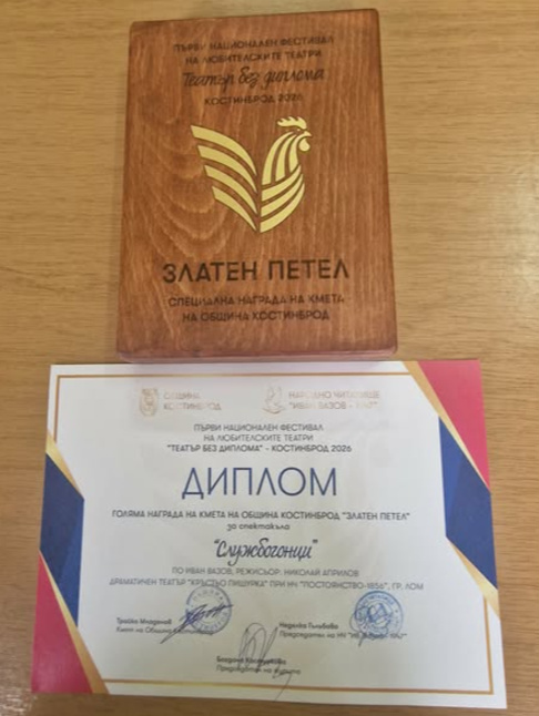 Драматичният театър „Кръстьо Пишурка“ при Народно читалище „Постоянство 1856“ в Лом завоюва две престижни отличия от първото издание на Националния фестивал на любителските театри „Театър без диплома“ в Костинброд, съобщават от културната институция. Театралната трупа беше отличена с голямата награда на фестивала „Златен петел“, както и с наградата на публиката за мюзикъла „Службогонци“ по Иван Вазов, с режисьор Николай Априлов.