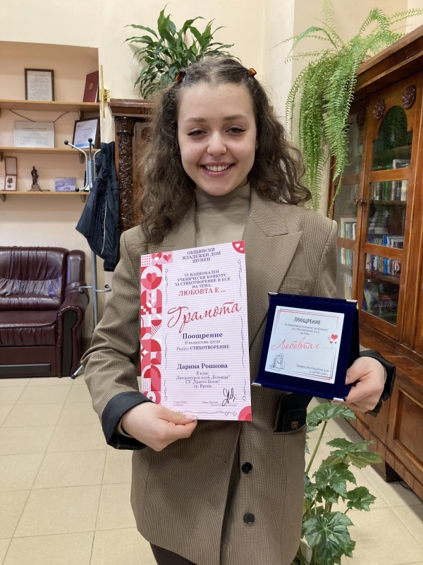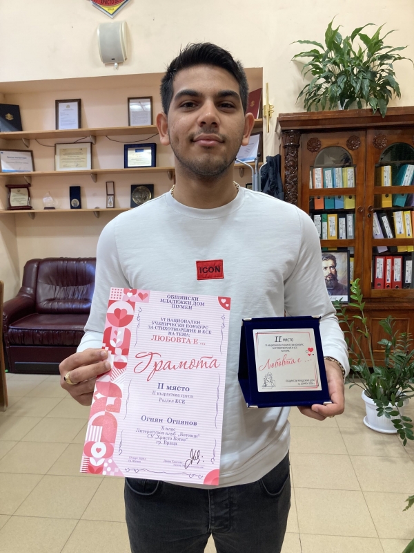 Второ място получи Огнян Огнянов, в Раздел Есе, II възрастова група / VIII – XII клас /, а поощрителна награда взе Дарина Рошкова в Раздел Стихотворение, II възрастова група / VIII – XII клас / на VІ Национален ученически конкурс за стихотворение и есе „Любовта е...“, организиран от Общински младежки дом – Шумен.