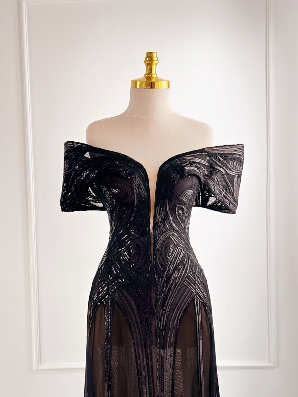 Тоалетът е решен в черно, материята е специално създадена за „Кавиар котюр“ в Париж френска дантела, а формите са характерните за виенския сецесион флорални мотиви в изчистени геометрични форми, които придават усещането за класа, изтънченост и съвършена, божествена хармония.