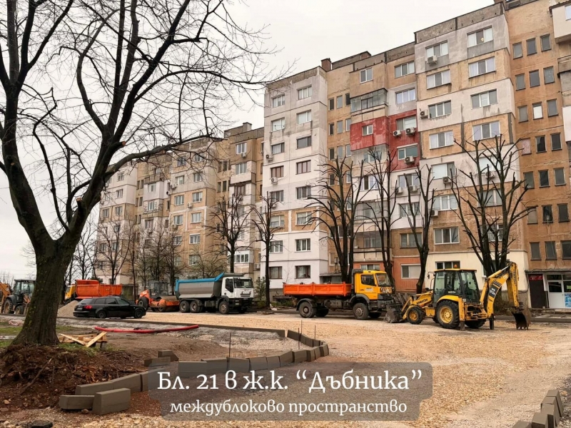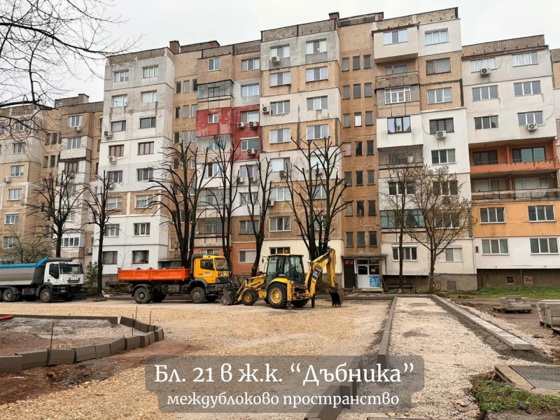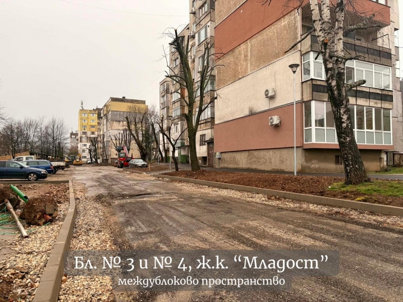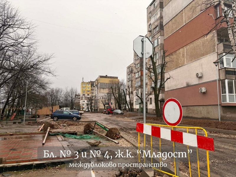 В ход са строително-монтажните работи по ул. „Антим I-ви“ и ул. „Ген. Леонов“, както и в междублоковите пространства при блокове №21 и №34 в ж.к. „Дъбника“, блокове №3 и №5 в ж.к. „Вапцаров“ и блокове №3 и №4 в ж.к. „Младост“.