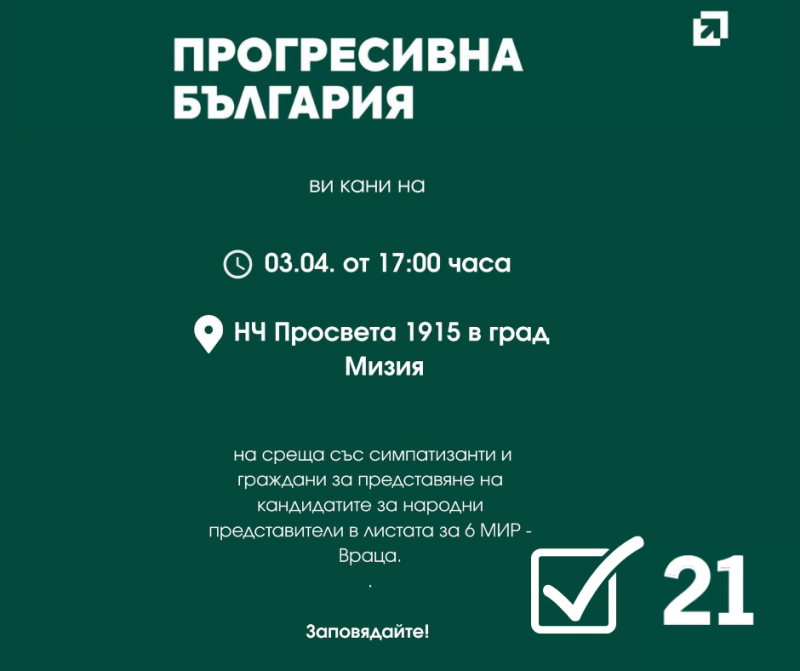 Коалиция “Прогресивна България” ще проведе среща със симпатизанти и граждани за представяне на кандидатите за народни представители в листата за 6 МИР - Враца в община Мизия.