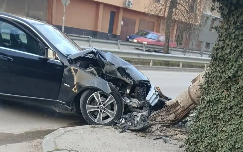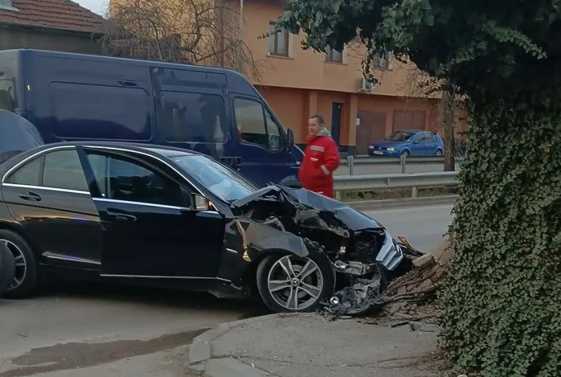 По неясни към момента причини лек автомобил „Мерцедес“ се е качил на тротоара и се е забил челно в електрически стълб.