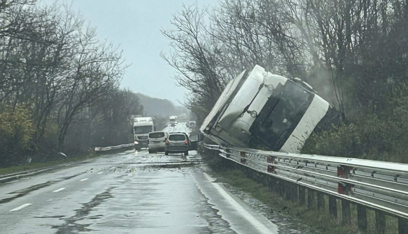От снимки, споделени в социалната мрежа обаче личи, че сблъсъкът е бил силен, а вследствие на това камионът се е озовал зад предпазната мантинела.