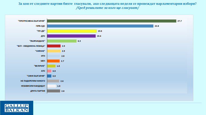 Проучването сочи, че пет са сигурните формации в следващия парламент. Първа политическа сила с отчетлива преднина сред решилите за кого ще гласуват е „Прогресивна България“ - 27,7%. В сравнение с регистрираните 29,8% в проучването от февруари, се забелязва известен спад, но това все още не дава основания да се смята, че е налице устойчива тенденция. По-скоро се проявява волатилността в електоралния ръст на тази формация, върху която влияе тяхната вяла предизборна кампания досега и късното обявяване на наименованието на коалицията.