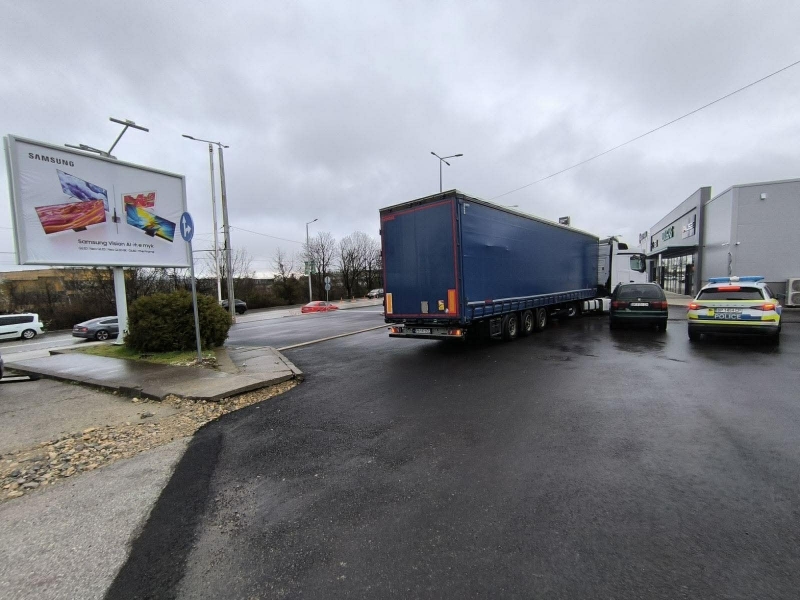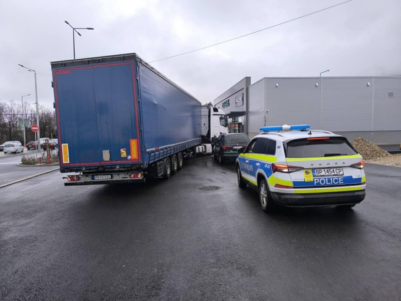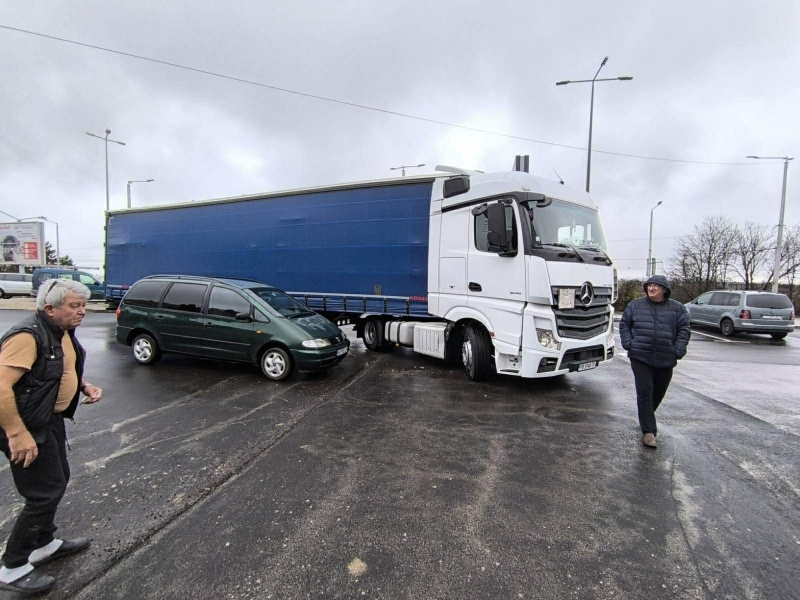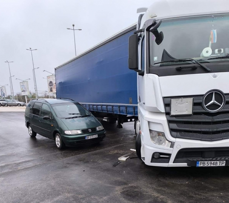Произшествието е станало тази сутрин, около 10 часа. ТИР е помел кола на паркинга на търговските обекти.