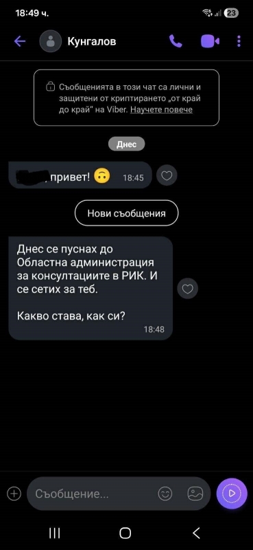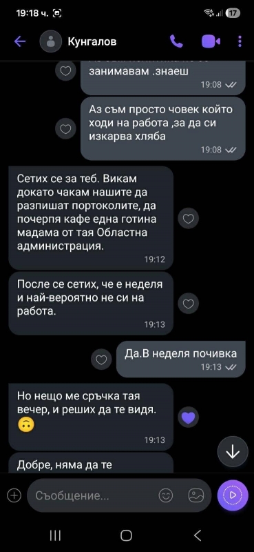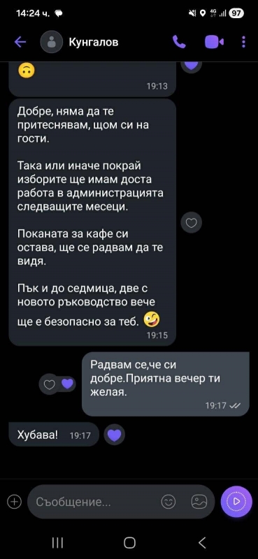 В някои общества неговото поведение може да се тълкува като търговия с влияние и затова има член в Наказателния кодекс. Важно е да уточним, че изхвърлената от областната администрация служителка е готова да свидетелства, ако се възбуди наказателно преследване срещу лидера на „Продължаваме Промяната“ във Враца Кирил Кунгалов. Тя пази още чувствителни чатове с проваления политик, които на този етап ще спести на обществото.