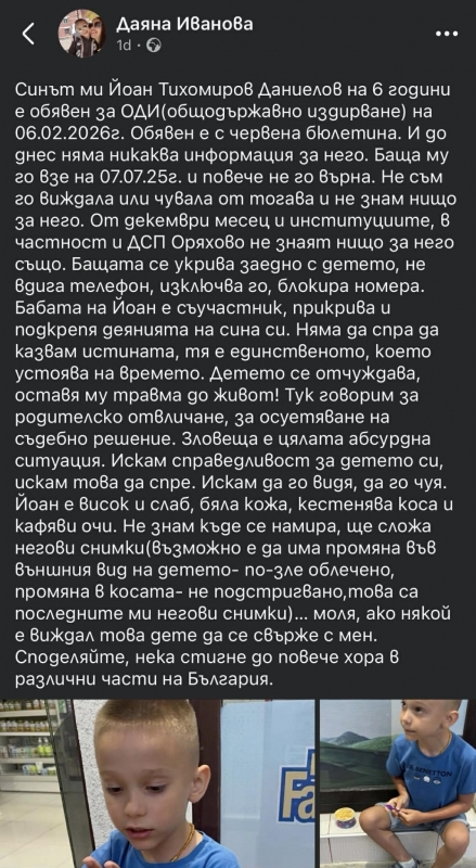 Причината за това е, че почти 9 месеца няма никаква информация за него, след като баща му го взима от майка му на 07.07.2025г. и повече не го връща.