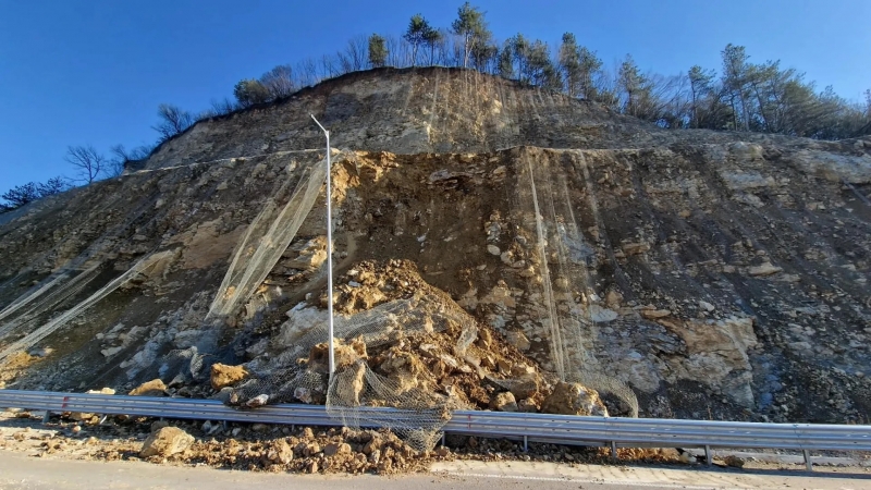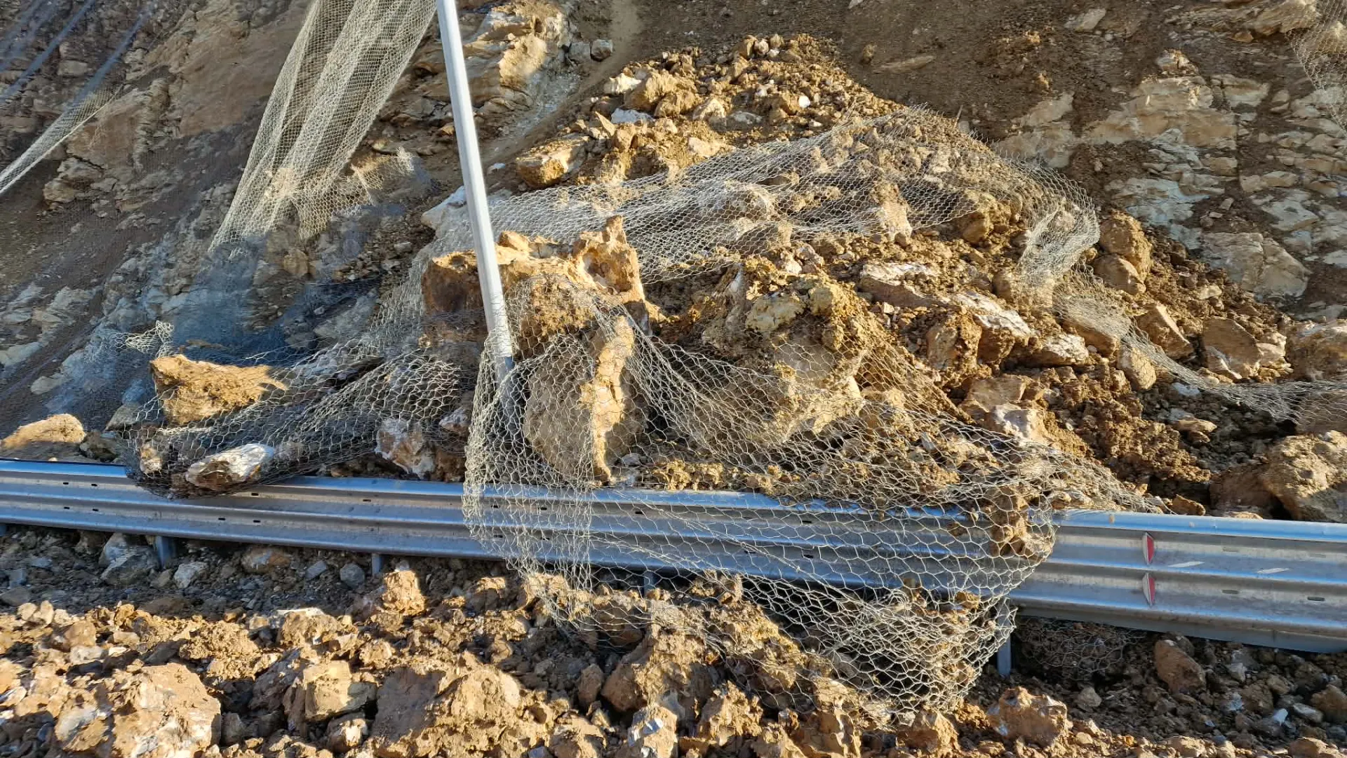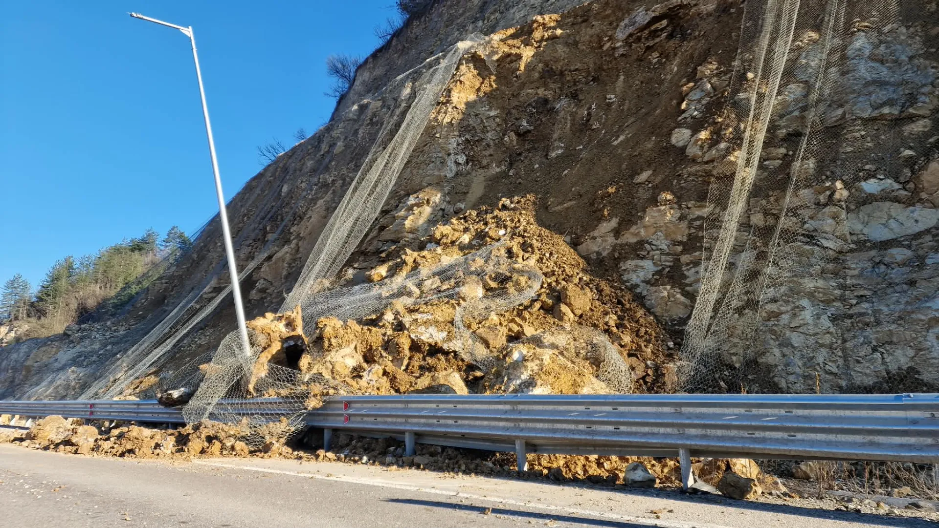 Случаят е от снощи, при отклонението за Дърманци. След последните дъждове, огромни камъни са паднали от над 10 метра височина. Те разкъсали мрежата, с която е „обезопасено“ мястото, и са се свлекли на платното.