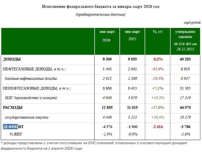 Дефицитът в руския бюджет за първите три месеца на годината надхвърли 4.5 трилиона рубли, което е повече от планирания за цялата 2026 г. - 3,8 трилиона рубли. Това показват данните на руското министерство на финансите. Такава бюджетна "дупка" за първото тримесечие не е имало никога за времето на войната на Русия срещу Украйна. През 2025 г. той бе 1,96 трлн., през 2024 – 0,6 трлн., през 2023 – 2,4 трлн. През 2022 г. имаше излишък.