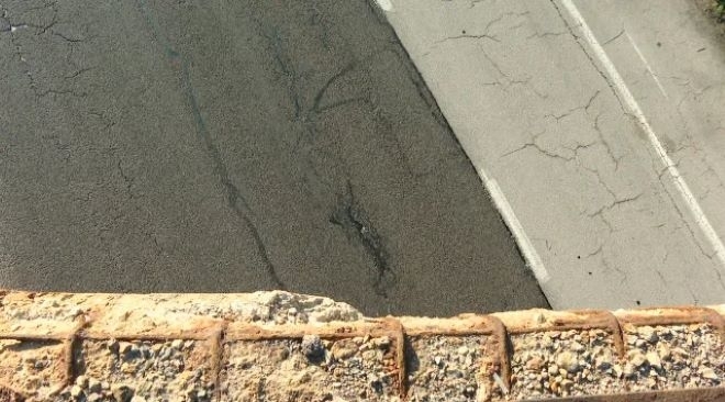 Тази дупка е на мястото на свързващата фуга, има ръждясали и откъснати мантинели. От годините част от парапета се е изкъртил. Оказва се, че само лек допир е достатъчен, за да се откъсне.