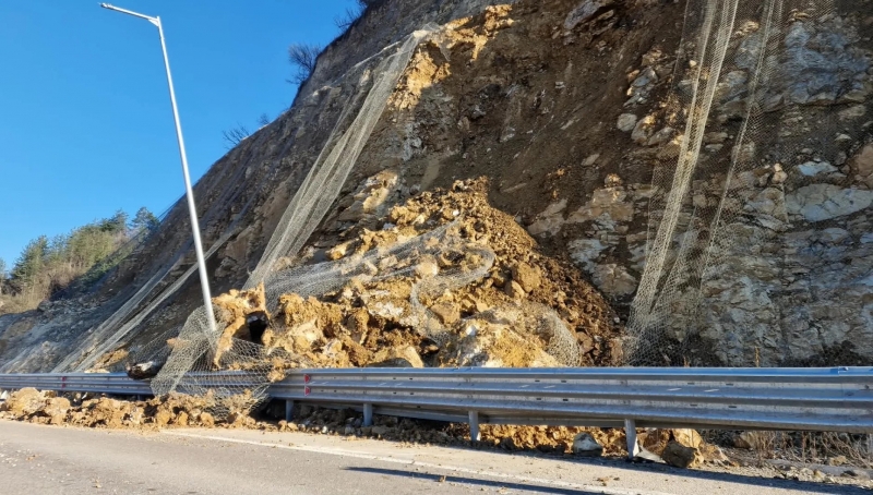 Падналите камъни са разкъсали предпазната мрежа, а единствено разстоянието до мантинелата е предотвратило блокиране на пътното платно и по-сериозен инцидент.