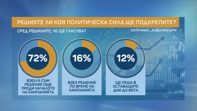 Според проучването 72% от хората са решили за кого ще гласуват още преди началото на кампанията. Тези, които са взели решение по време на нея, са 16%, а тези, които все още не са решили, са 12%.