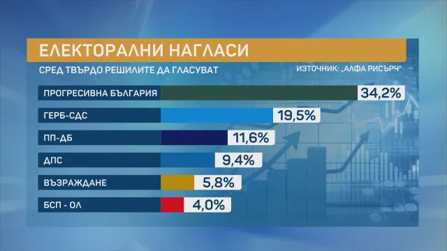 Според изследването шест партии влизат в 52-ия парламент. Първа политическа сила е „Прогресивна България“ с 34,2%. Втори са ГЕРБ-СДС с 19,5%, трети – ПП-ДБ с 11,6%, четвърти – „ДПС-Ново начало“ с 9,4%, пети са „Възраждане“ с 5,8%.