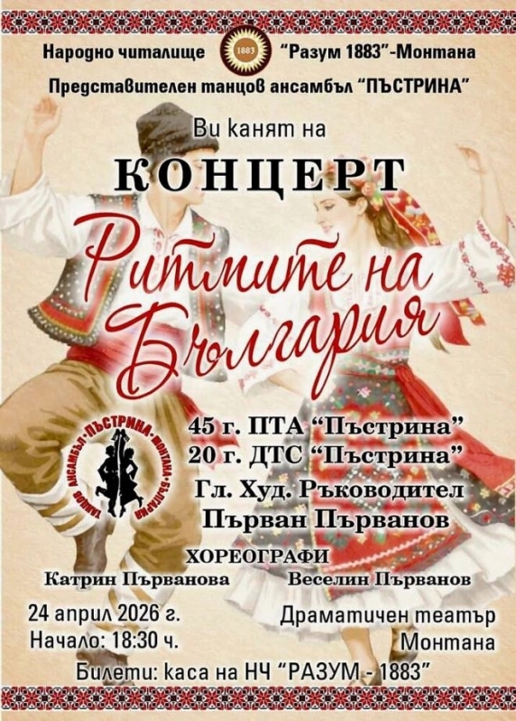 Представителен танцов ансамбъл „Пъстрина“ ще отбележи своята 45-годишнина с концерта „Ритмите на България“ на 24 април в Драматичен театър „Драгомир Асенов“ в Монтана, съобщиха от общинската управа. Със събитието ще бъдат отбелязани и 20 години от създаването на Детския танцов състав „Пъстрина“.