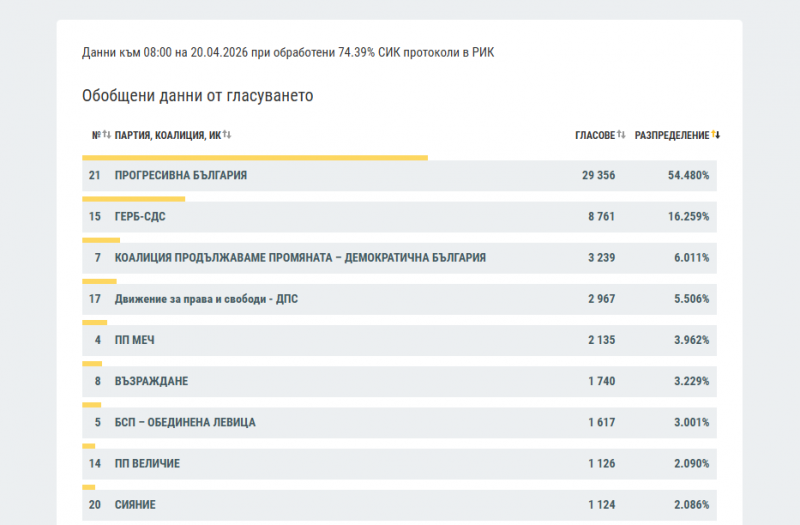 Данните към този момент сочат, че хората на Румен Радев са подкрепени от над половината от стигналите до урните в неделя - 29 356 души, което е 54.48 %. На второ място с много голяма разлика са ГЕРБ-СДС. Те са срещнали подкрепа едва от 8 761 човека или 16.25 % от гласуващите. Трети са коалицията „Продължаваме промяната-Демократична България“. За тях гласа си вчера са дали 6.01 % от хората /3 239 души/