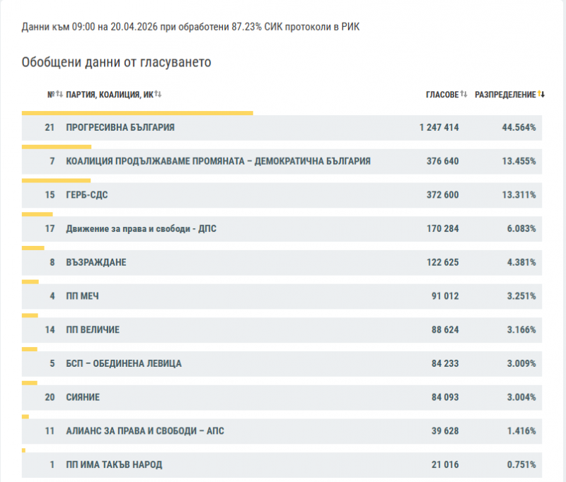 Централната избирателна комисия излезе с първи резултати от предсрочния парламентарен вот на 19 април. При обработени 87.23 % СИК протоколи в РИК „Прогресивна България” на Румен Радев води с убедителен резултат от 44.56 %.