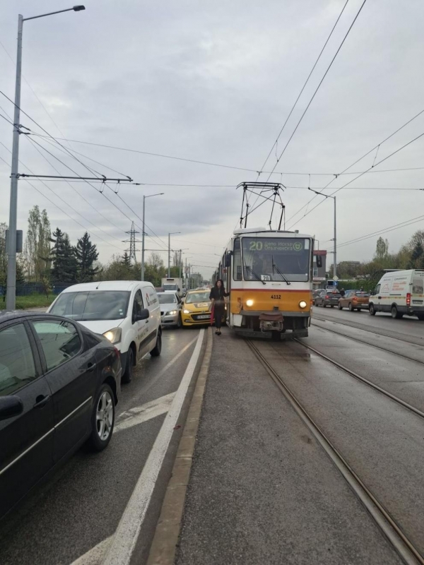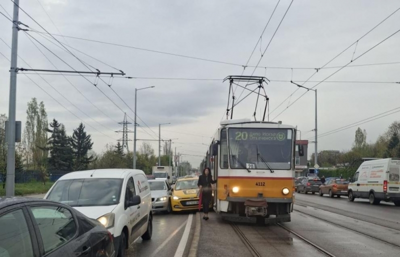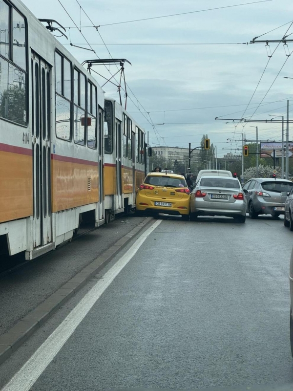Нов инцидент с участието на трамвай в София. Таксиметрова кола остана заклещена между трамвай и друг автомобил в сряда сутрин, когато трафикът обичайно е натоварен.