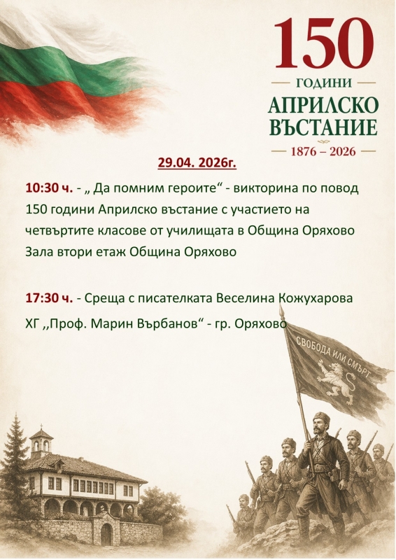 10:30 ч. - „ Да помним героите“ - викторина по повод 150 години Априлско въстание с участието на четвъртите класове от училищата в Община Оряхово.