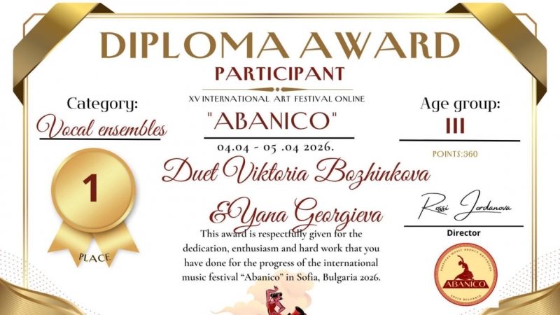 Децата от вокална група Шоколадче се класираха на първите места в онлайн изданието на Международен конкурс Abanico 2026, научи BulNews.