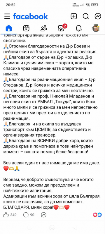 Благодаря на проф. Николай Младенов и неговия екип от УМБАЛ „Токуда“, които бяха много мили и се грижиха за мен непрестанно през целия ми престои в отделението по реанимация.