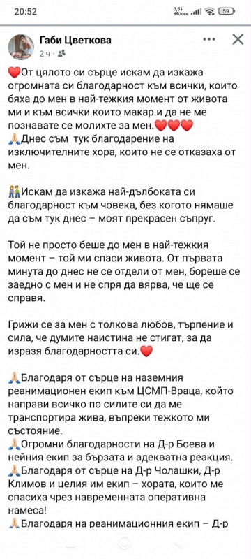 По този повод, младата жена снощи излезе с трогателен пост в личния си профил във фейсбук, който е адресиран до всички „мили хора, които са ѝ помогнали“. В него тя благодари, както на близките си и на лекарите, които са се борили за живота ѝ, така и на всеки един човек, молил се тя да се възстанови.