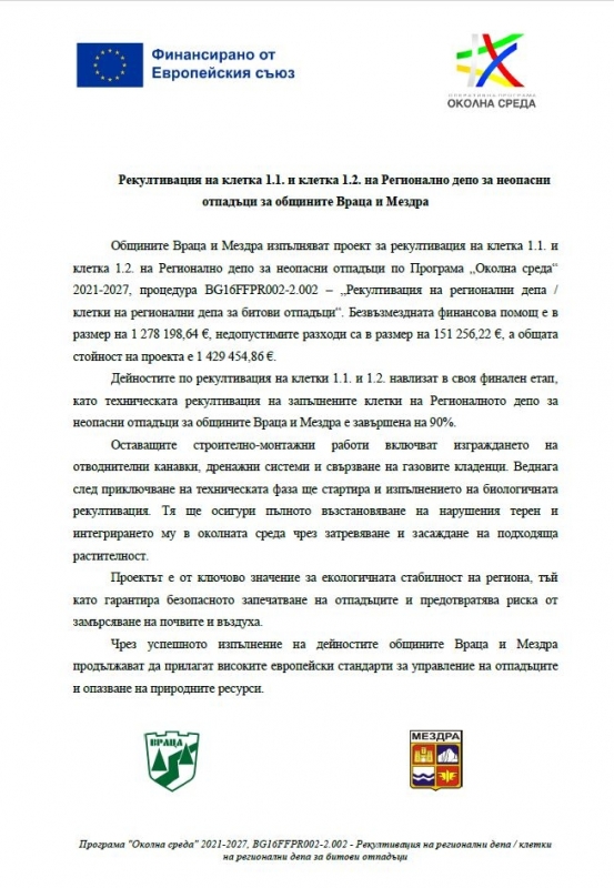 Общините Враца и Мездра изпълняват проект за рекултивация на клетка 1.1. и клетка 1.2. на Регионално депо за неопасни отпадъци по Програма „Околна среда“ 2021-2027, процедура BG16FFPR002-2.002 – „Рекултивация на регионални депа / клетки на регионални депа за битови отпадъци“.