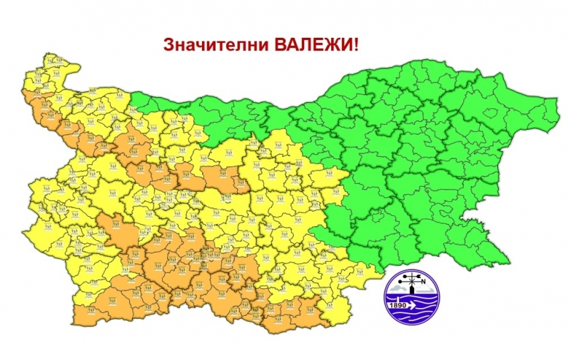Предупреждението е в сила за части от областите Враца, Монтана и Видин, а също за Благоевград, Пловдив, Пазарджик, Смолян, Кърджали и София.